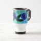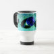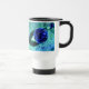 Las gotitas de agua en una hoja después de la lluvia se alienaron en un color azul. Una fotografía de naturaleza macro de las gotas de lluvia de Katho Menden. Esta taza de viaje es una idea para los amantes de la naturaleza. http://www.zazzle.com/kathom_photo