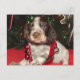 Dulce, hígado/melado, cuello del navidad su del hermano mayor que lleva del perro de aguas de saltador de Engllish perrito, para Santa que espera delante del árbol de navidad.