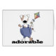Un adorable perro manchado de blanco y marrón con el vientre gordito vestido de denim vuela una cometa y un texto negro que dice "Adorable".