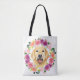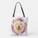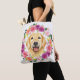 La esta bolsa de asas bonita tiene un perro del labrador retriever del amarillo de la acuarela dentro de una guirnalda floral de púrpura, de rosado, melocotón, amarillo, azul, y las flores y las hojas de la acuarela del verde.
