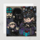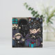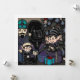 Hermoso perro cachorro de Newfoundland dibujado y coloreado a mano en una paleta de colores góticos oscuros, completo con duendes de las fiestas de Navidad, regalos y un cascanueces.