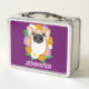 Crea un regalo personalizado que es perfecto para los dueños de perros corgi o para cualquiera que ame los perros. Esta lonchera presenta un bonito ilustracion de primer plano de la cara de un corgi rodeado de flores de bonito en naranja, amarillo, blanco y lavanda. El gráfico está ajustado en un fondo morado y hay un punto para agregar un nombre con letras en negrita de color lavanda.