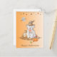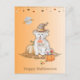 Una linda tarjeta de Halloween con un perro usando un gorra y corbata de arco con un cubo de caramelos de Halloween.