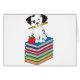 Un perrito dálmata con un lápiz en su boca se está sentando en una pila de libros. Modifique este producto para requisitos particulares con un nombre o un mensaje para hacerlo verdaderamente único