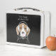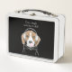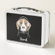 El diseño presenta el ilustracion de un beagle relajante con auriculares y un bubblegum rosa que sopla. Con tu texto personalizado y tu color de fondo favorito, hace una caja de almuerzo metalizado linda, divertida y única.