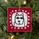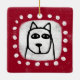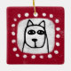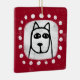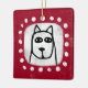 Un lindo perro dibujado en blanco y negro sobre un fondo rojo texturado rodeado de puntos blancos.