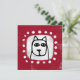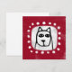 Un lindo perro dibujado en blanco y negro sobre un fondo rojo texturado rodeado de puntos blancos.