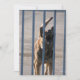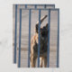 Guardia perro ladrando detrás de barras de hierro azul. Fotografía.