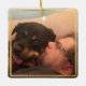 No hay amor como el amor de un perro. Aunque viven vidas más cortas que nosotros, el vínculo que tenemos con ellos nunca muere y merece un lugar en nuestros hogares como ese amor tiene en nuestros corazones. Este sencillo ornamento conmemorativo con marcos dorados ofrece espacio para dos fotos, una con un simple superpuesto para añadir el nombre y los datos de su vida. Usa para siempre en nuestros corazones o tu propia frase en recuerdo.