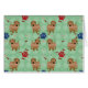 Un adorable dachshund rojo al estilo personalizado con una expresión amigable se alza contra un fondo de verde con una huella de pata azul centrada entre cuatro copias de la imagen del perro. El fondo está esparcido con más huellas de pata y huesos de juguete. Este patrón está en mosaico de modo que se transfiera fácilmente a otros tipos de productos.