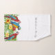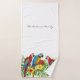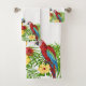 Aves tropicales, loros en azul, amarillo y rojo sentados sobre hojas de palma verdes. Decorado con flores tropicales. Elegante fondo blanco. Plantilla para el nombre de su familia, escritura de estilo con letras de mano negra. Utilice su tecla de retroceso para borrar si desea la toalla sin texto ni nombre.