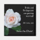Un imán de frigorífico de bonito "Salven la fecha" para que lo personalizes, con un rosebudo rosa pálido, "Nuevo amanecer", sobre un fondo negro, de una fotografía de Judy Adamson