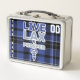 Lacrosse Almuerzo Metalizado Tin. Añade tu propia elección de nombre y número a la lata para hacer un gran almuerzo personalizado, para la escuela, universidad, oficina o viajes! Utilice los cuadros de texto en el lado derecho de la imagen. Gran diseño de texto en tonos azules con un palo Lacrosse y bola y el texto Live LAX y Prosper.