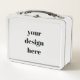 Color: Blanco Adorable y duradero, nuestra metalizado caja de almuerzo es perfecta para los enamorados del estilo clásico. Personaliza el anverso y el reverso con las imágenes, texto y diseños que quieras y diseña una fiambrera increíblemente divertida para tus hijos o para ti. Dimensiones: 6,75" l x 8,625" ancho x 3,75" h Peso: 12 oz. Fabricado con placa de estaño de seguridad para alimentos y duraderos Material interior seguro para el Personalizar solo frente o frente y espalda Elección de 6 colores base Mangos de plástico negro colapsables Reclamación de CPSIA Este producto es adecuado para edades de 5 años