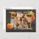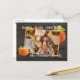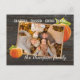 Única, elegante, de moda, bonito y decorativa tarjeta de fiesta de Acción de Gracias. Gracioso agradecimiento por dar gracias texto y espacio al personalizar o personalizar con una foto y nombres (o apellido) de su elección. Con calabazas clásicas de naranja en una casa de campo rústica de aspecto gris y aspecto templado inspirado en el diseño de fondo de tablas de madera de pino. Y un poema de bienvenida de temporada de personalizable en el reverso de la tarjeta.