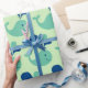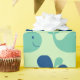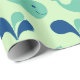Un caprichoso papel de envolvimiento de cumpleaños para los niños, con una ballena juguetona y espinosa. La ballena es una mezcla vibrante de tonos verdes y azules, con un cuerpo suave y redondeado y una expresión alegre. Rocios de agua de su agujero de soplo en gotas curvadas y caricaturizadas, añadiendo un elemento divertido y dinámico al diseño.