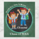 Una bonita carta de vinos con dos niños personalizados sobre una pizarra y un fondo de pizarra. Ideal para bajar después de un año escolar ocupado y un hermoso regalo para un profesor.