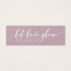 Esta elegante mini tarjeta contiene las palabras "let love glow" en escritura blanca y un color de fondo editable (click personalizar para acceder). Hace un gran favor de boda para tus regalos de favor de boda. Es fácil de personalizar; basta con reemplazar el texto del marcador de posición para añadir su propia información. Para obtener más opciones, como cambiar el tipo de letra, el tamaño del texto o el espaciado entre letras, haga clic en el botón "Personalizar". *Tenga en cuenta que la marca de agua Zazzle que aparece en la vista previa del zoom NO aparecerá en el producto impreso final. © Rosewood y Citrus