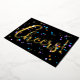 Tarjeta de bienvenida contemporánea clásica de Año Nuevo de temporada navideña con fuegos artificiales de confeti multicolor y dorado y lindo Relieve metalizado de oro de verdad Cheers! caligrafía de texto. Con opción y espacio para el personalizar del texto, el nombre de la familia, la fecha del año y un mensaje de bienvenida de la temporada de personalizable en el dorso de la tarjeta.