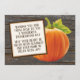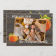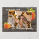 Única, elegante, de moda, bonito y decorativa tarjeta de fiesta de Acción de Gracias. Cute CON AMOR DE texto y habitación a personalizar o personaliza con una foto y nombres (o apellido) de tu elección. Con calabazas clásicas de naranja en una casa de campo rústica de aspecto gris y aspecto templado inspirado en el diseño de fondo de tablas de madera de pino. Y un poema de bienvenida de temporada de personalizable en el reverso de la tarjeta.