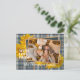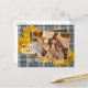 Única, elegante, de moda, bonito y decorativa tarjeta de fiesta de Acción de Gracias. Cute CON AMOR DE texto y habitación a personalizar o personaliza con una foto y nombres (o apellido) de tu elección. Con adorables Mamáes cálidas de otoño amarillo cálido, las calabazas florales sobre una verde azulada casa de campo rústica de color azul, mostaza ocre, marrón y gris, inspirado en el diseño de fondo de lona de lona trenzada. Y un poema de bienvenida de temporada de personalizable en el reverso de la tarjeta.