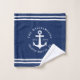 Cree una toalla de tela marina monogramada única que tenga un diseño azul marino claro y blanco con un ancla y rayas onduladas. El texto de la plantilla permite personalizarlo con facilidad con el nombre de su familia, año y lugar. Se trata de una decoración de baño de diseño para una casa de playa y lago, un yate o un barco.