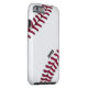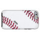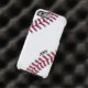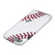 funda de iPhone 6 de béisbol Personalizado, con gráficos del estilo rojo cosiendo una pelota de béisbol, en la esquina superior izquierda y en la esquina inferior derecha del funda blanco. Personalice el texto negro según sus necesidades.