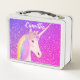 Comida Metalizado para Chicas de Fantasía Unicorn, Purpurina Púrpura Púrpura Púrpura, Unicorn. Diseñada tanto en la parte frontal como en la parte posterior con fondo purpurina falso rosa y púrpura, y un unicornio blanco con pelo arco iris. Personalizado con el nombre del niño en letras blancas en la parte superior. Excelente para los chicas de la escuela.