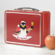 Casilla de almuerzo con un ilustracion de un lindo pingüino real sosteniendo un cetro y usando un sombrero rojo de Papá Noel; diseño de personalizado de vacaciones para Navidades para niños