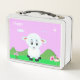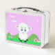 Personalizado de ovejas alegres, flores y estrella en fondo violeta Caja de almuerzo. El texto feliz se puede personalizar.