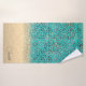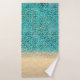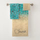 En este elegante juego de toallas se encuentra un cobertizo metálico dorado en la parte inferior de la gran toalla, donde se puede personalizar un patrón oro purpurinoso que se mezcla en una impresión purpurinoso de leopardo plateado con un fondo turquesa para obtener más información. Moda Glam vibra.