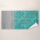 En este elegante juego de toallas se encuentra un cobertizo metálico plateado en la parte inferior de la gran toalla donde se puede personalizar un patrón de plata purpurinoso que se mezcla en una impresión purpurinoso de leopardo plateado con un fondo turquesa para obtener más información. Moda Glam vibra.