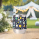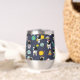Un gráfico de clipart astronauta, Espacio Ultraterrestre: astronauta sosteniendo globo como planeta, un cohete, estrellas, icono de OVNI, icono del satélite espacial, planeta Saturno, nave espacial y otros. Sobre el fondo azul marino de Oxford.