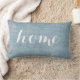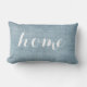 Denim impreso en almohada personalizado con la palabra home en texto de plantilla en blanco. almohada azul claro con texto blanco para tu casa. Denim impreso a ambos lados de esta almohada lumbar. Hay otras opciones de almohadas disponibles. Una almohada de acento perfecta para su cama, sofá, silla o regalo de bienvenida.