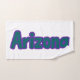 Esta toalla de mano personalizado presenta un diseño que muestra la palabra "Arizona" en un tipo de letra Boldoa impresa y letras de color púrpura con un contorno turquesa en este tema del estilo jersey del orgullo del estado personalizado. Esta toalla está fabricada con una parte delantera de mezcla de poliéster, mientras que la parte posterior es 100% de algodón, todas las toallas usarán impresión sublimada/vibrante, diseñada para durar.