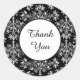 Un personalizado Gracias pegatina circular con arte floral vintage en blanco sobre fondo negro. Personalizar para cambiar fuentes, colores de fondo, subir una imagen y más, incluso guardar el diseño para más adelante.
