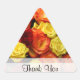 Un conjunto de pegatinas de "gracias" rosas triangulares con rosas en rojo, naranja y amarillo. Perfecto para los amantes de los rosas. ¡Las palabras "Gracias" son personalizable!