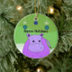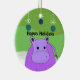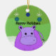 Un diseño divertido con un hipopótamo personalizado con copos de nieve y decoraciones navideñas encima de él. Un fondo verde y sombreado.