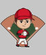 Un lindo ilustracion al estilo personalizado de un joven jugador de béisbol vestido con un uniforme rojo con una gorra a juego. El personaje tiene una pelota de béisbol en ambas manos, de pie confiado en un campo de béisbol. Este diseño es perfecto para las mercancías, pegatinas o prendas deportivas con temática de béisbol, que atraen tanto a los niños como a los aficionados al deporte.