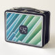 Lleve las comidas con estilo con esta moderna caja de almuerzo metalizado con monograma abstracto azul y verde. Perfecto para la escuela, el trabajo o el viaje.