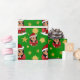 Navidades envolviendo papel con el ilustracion de una linda sonriente y feliz chica con el pelo largo negro, lleva disfraz rojo y blanco de Santa Claus y tiene un regalo; con plantilla de texto editable para tu nombre o mensaje, Navidades diseño de vacaciones con un fondo verde sin fisuras con estrellas