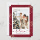 El rojo personalizado y el oro creen que las tarjetas de Navidades con regalos de Navidades y nevada en un oscuro fondo rojo. Personaliza fácilmente estas tarjetas de Navidad de confianza con tu foto y tu texto.