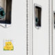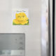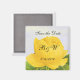 Un imán Save the Date con letras de guión y espacio para tu texto personalizado, decorado con una rosa amarillo bonito sobre un fondo azul crema y cielo.