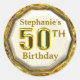 Se muestra "El 50 cumpleaños del nombre" en estos grandes pegatinas y sellos para sobres. ¡Añade el nombre de cumpleaños para personalizar a estos grandes pegatinas! 50 es en un gráfico de números dorados de clase sobre un fondo dorado. Se muestra el popular pegatina de forma redonda. Este sello pegatina se ha añadido a la decoración de un marco blanco de estilo vintage y un borde dorado con un diseño en 3d. Bonito y único, pero asequible. Haz grandes favores y sellos para sobres para un cincuentenario de oro, 50 cumpleaños, reunión o cualquier ocasión especial.