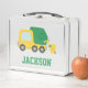 Un camión de basura verde y amarillo brillante con un basurero. En el lado del camión está el reciclado, la reutilización y la reducción del logotipo. Personalizar con el nombre del niño.