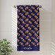 This football bath towel design is complete with a seamless pattern of footballs as well as a dark blue background color and a place to add your name.
