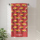 This construction-themed kids bath towel design is complete with a seamless pattern of yellow dump trucks set against a simple red background. There is a place to add your name at the bottom of the towel.