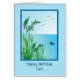 Un bonito escenario de pesca marina. Una tarjeta de cumpleaños maravillosa para un gemelo que ama la pesca, o que solo ama el mar. Las hierbas altas enmarcan una vista de un océano tranquilo con un pequeño bote y un hombre pescando. El versículo interior tiene la buena suerte del pescador que desea "líneas apretadas".