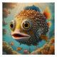 Un pez Puffer muy detallado con ojos expresivos se representa en un fondo suave y borroso. Los colores naturales realzan el aspecto realista.