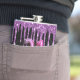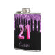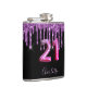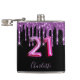 Un regalo de los amigos para una chica glamurosa y glamurosa de 21 años. Un fondo negro clásico con goteos en purpurina de imitación violeta, pinturas de goteo. Personalice y agregue un nombre.El texto: El nombre está escrito en violeta con un estilo de escritura moderno con letras a mano. La edad de 21 años está escrita con un tipo de letra a la moda en globo. Atrás: agrega tu texto y nombres.